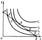 Какая же из точек на бюджетной линии соответствует оптимальному, с точки зрения потребителя, набору товаров? Рассмотрим точку F . Точка F лежит на пересечении бюджетной линии АВ и кривой безразличия I 1 . Кривая безразличия I 1 пересекает бюджетную линию также в точке G . Очевидно, что точки F и G не являются наиболее предпочтительными для потребителя, поскольку при движении вниз по бюджетной линии от точки F и вверх по бюджетной линии от точки G потребитель переходит на более высоко расположенные кривые безразличия и, следовательно, на более высокий уровень полезности. Рассмотрим теперь точку С , более предпочтительную, чем точка F . Точка С лежит на кривой безразличия I 2 пересекающей бюджетную линию в точке D . Точки С и D не являются точками оптимального потребительского выбора по тем же причинам, что и точки F и G . Вообще говоря, из свойств кривых безразличия и из рис. 8 очевидно, что если некоторая кривая безразличия пересекает бюджетную линию в двух точках, то все точки бюджетной линии между ними будут более предпочтительны для потребителя. И лишь в том только случае, если кривая безразличия имеет одну и только одну общую точку с бюджетной линией (точка Е на рис. 8), эта точка соответствует наиболее предпочтительному для потребителя набору товаров из всего множества доступных этому потребителю наборов. Точка Е называется точкой потребительского оптимума , поскольку расположена на наиболее высоко лежащей из доступных потребителю кривых безразличия, т.е. соответствует наиболее высокому уровню удовлетворения при данных доходе потребителя и ценах товаров.