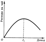 На рис. 14 представлена линия доход-потребление некоторого потребителя для случая чай-кофе. Легко заметить, что эта линия на участке выше точки К поворачивает в направлении уменьшения потребления чая (в отличие от линий доход-потребление для пищи и одежды, изображенной на рис. 13). Такой поворот линии доход-потребление на рис. 14 означает, что при уровне дохода потребителя, превышающем уровень, для которого оптимальной комбинацией кофе и чая является набор K , чай становится низшим благом. На основе рис. 14 можно построить кривую Энгеля для расходов на чай (рис. 15).