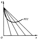 Если изменение дохода при постоянных ценах выражалось в параллельных сдвигах бюджетной линии, то изменение цены на один из товаров при постоянстве дохода и цены другого товара будет выглядеть как поворот бюджетной линии (рис. 16). Таким образом, каждому значению цены товара Х будет соответствовать своя бюджетная линия, а каждой бюджетной линии - своя точка касания с какой-нибудь кривой безразличия. Соединив все эти точки выбора, как в предыдущем разделе, мы получим линию цена-потребление товара X .