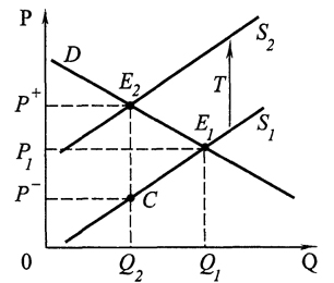 Если потоварный налог вносится в госбюджет покупателями, то происходит сдвиг параллельно вниз на величину Т линии спроса D. Основная суть модели от этого не меняется.