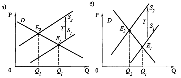 Это вызовет параллельный сдвиг линии предложения вверх на величину Т. Если ранее производители согласны были предложить на рынке количество товара Q1 , если его цена составит P1, то теперь они согласятся предложить на рынке то же количество товара, если только цена-бруто (с включением налога) будет на Т руб. выше, чем Р1 В этом случае производители получат цену-нетто (без включения налога), равную прежней цене. Это рассуждение применимо к любой точке линии предложения. Поэтому все точки линии предложения переместятся вверх на Т руб. Линия предложения займет положение S2 .
