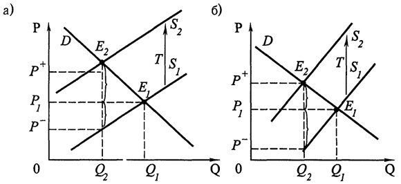 На рисунке «б» изображена ситуация, когда линии спроса и предложения имеют крутые наклоны. Допустим, что речь идет о железнодорожных вагонах независимо от их цвета. Введение потоварного налога такого же размера, что и в первом случае, вызывает гораздо меньшее сокращение равновесного объема рынка.