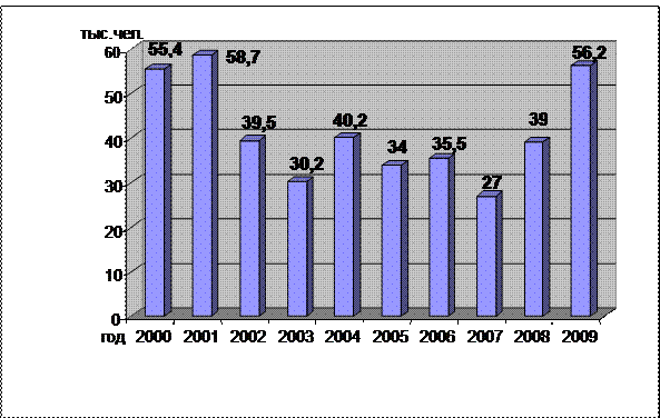 Видно, что в 2009 году заметно увеличилось количество безработных граждан и составило 56,2 тыс. Примерно такой же высокий уровень безработицы в области был зафиксирован только в 2000 и 2001 годах. Причина такого скачка безработных кроется в экономическом кризисе, который отразился и на Вологодской области. Появление массовой безработицы – это одно из наиболее ощутимых последствий кризиса, наряду с инфляцией и темпами падения экономических показателей. Аналогично можно сказать и про численность занятых в эти годы. За пределами кризиса уровни занятости и безработицы стабильны.