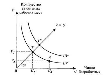 На основе этого подхода полная занятость (или отсутствие дефицита или избытка в спросе на труд) будет, когда U=V, т.е. в точке, где кривая UV пересекается с линией V=U, выходящей из начала координат под углом 45° (точка Т на рис. 1). При этом полная занятость соответствует естественному уровню безработицы UT . В этой точке занятость полная в том смысле, что безработицу (состоящую из структурной и фрикционной) можно рассматривать как характеристику данного рынка труда в точке равновесия, а не как результат превышения предложения над спросом.