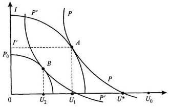 На рис. 2 показана зависимость между инфляцией и безработицей, известная как кривая Филлипса (РР). Кривые безразличия I и I’ отражают предпочтения правительства (общества) по отношению к комбинации допустимых значений безработицы и инфляции. Кривые безразличия, отражающие более благоприятную для правительства ситуацию, расположены ближе к точке начала координат. Если первоначальная безработица равна U0 , то за счет увеличения спроса она может быть сокращена до U1 , так что максимально достижимый уровень предпочтительности для правительства комбинации инфляция – безработица будет I, и он будет касательным к существующей кривой Филлипса (РР) в точке А. Тогда разница в безработице (U0 – U1 ) будет составлять спросодефицитную часть безработицы, т.е. ту часть, которая может быть уменьшена за счет политики увеличения совокупного спроса без ухудшения приемлемого для общества сочетания безработицы и инфляции.