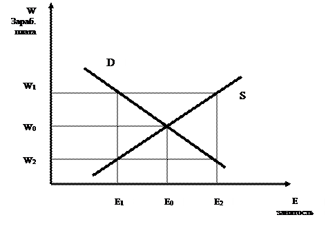 1. Классическая модель. Согласно классической модели, представленной на графике (рис.1), в точке пересечения линий D и S , отражающих спрос и предложение на рынке труда, устанавливается равновесная цена труда (заработная плата W 0) и определенный уровень занятости Е 0 . Если уровень заработной платы в силу каких-либо причин повысится с W 0 до W 1, то и величина предложения возрастет, т.к. на рынке труда появится дополнительное число лиц, ранее не соглашавшихся работать за заработную плату W 1. Однако спрос на труд сократится, поскольку работодателям будет невыгодно нанимать рабочую силу из-за ее дороговизны. Предложение рабочей силы превысит спрос на нее, что приведет к росту безработицы. Если уровень заработной платы опустится до W 2, для работодателей станет выгодно нанимать дополнительных работников, что увеличит спрос на труд. Однако предложение труда понизится за счет тех, кого не устраивает уровень заработной платы. В результате на рынке труда спрос превысит предложение, и возникнет дефицит рабочей силы. Согласно такому подходу, безработица в значительной мере носит добровольный характер, поскольку связана с нежеланием работников трудиться за недостаточно высокую, по их мнению, заработную плату. Главным фактором борьбы с безработицы выступает снижение заработной платы.