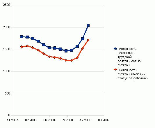 В начале 2009 г. численность зарегистрированных безработных достигла первоначального прогноза на конец 2009 г. Численность безработных на конец марта составила 2177 тыс. чел., а темп роста по сравнению с февралем — +8.2%. Прогноз на конец 2009 г. пересмотрен Правительством в сторону повышения, до 2800 тыс. чел. Фактический уровень безработицы в I квартале составил 9.5% (к численности экономически активного населения), численность безработных — 7107 тыс. чел. (согласно методологии МОТ).