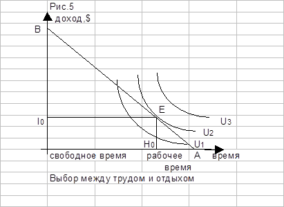 Продавая свое рабочее время, мы прекрасно понимаем, что оно должно быть меньше 24 часов, так как часть дня необходима для отдыха, то есть для восстановления способности к труду. Обычно точка E касания бюджетного ограничения к кривой безразличия для работы оставляет примерно треть суток. На графике свободное время H0 , рабочее время равно 24 - H0 , дневной доход равен W*(24-H0 ). Тангенс наклона бюджетного ограничения равен (-W). Это значит, что предельная норма замещения свободного времени доходом равна заработной плате: MRSHI = W. Далее допустим, что ставка заработной платы возросла. Бюджетное ограничение смещается в AB1.