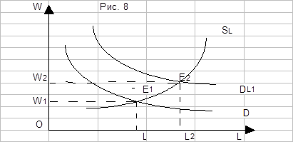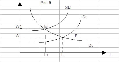 где W / P — есть реальная заработная плата. Таким образом, для совершенно конкурентной фирмы условием максимизации прибыли служит равенство реальной зарплаты и предельного продукта труда. Но на таком рынке фирма сама зарплату не устанавливает, а принимает как «данную». Но на основе этой ставки зарплаты фирма принимает решение о найме работников, об их количестве, необходимом для максимизации прибыли. Если например в отрасли повысится заработная плата, тогда прямая предложения сдвинется вверх ( S® S1 ) и фирма сократит количество работников до L1 . Поскольку сокращение работников произойдет во всех конкурирующих фирмах, то делаем вывод, что количество занятых обратно пропорционально уровню заработной платы.