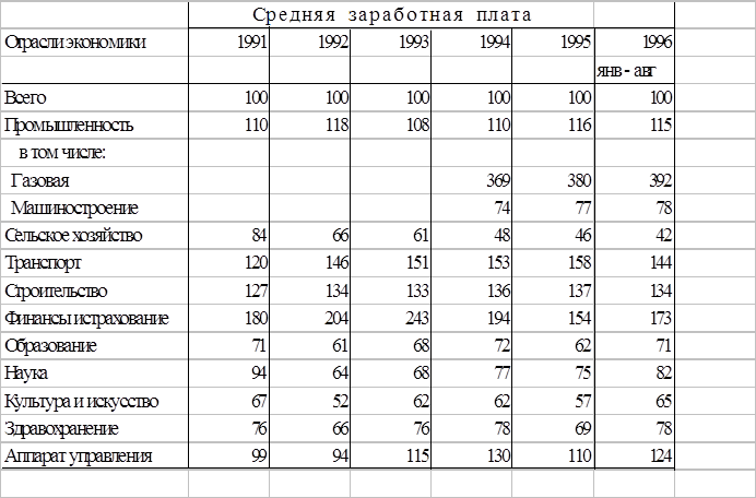 Из таблицы видно, что доля оплаты труда в ходе реформ имеет тенденцию к уменьшению. Какая - то часть оплаты труда наемных работников в рыночных структурах, конечно, скрывается, но все же налицо, что по сравнению с западными странами у нас доля зарплаты очень мала ( в США - 70,8%; в Японии - 94,0% ) в структуре денежных доходов. Причины этого - политика поддержки малообеспеченных слоев, то есть увеличение доли социальных трансфертов, отток людей в индивидуальное предпринимательство, а главное - бедственное положение предприятий, которые не могут платить достойную зарплату работникам. По данным 1994 г. у 56,4% россиян заработная плата является единственным источником средств существования, причем на дальнем Востоке эта цифра составляет 70-80%. На юге России зарплата является единственным источником существования примерно у трети населения. Но все равно в условиях, когда больше половины населения страны живет только на зарплату, падение ее доли в структуре денежных доходов свидетельствует о значительном снижении уровня жизни. Так, удельный вес работников с размером зарплаты ниже прожиточного минимума в 1995 г. был равен 36% ( 1994 - 29% ). Материальная необеспеченность и даже нужда подавляющей части трудоспособного населения является следствием ( среди прочих других причин ) усиления диспропорций в заработной плате между отраслями. Не секрет, что существуют высокооплачиваемые отрасли и отрасли, предприятия которых не в состоянии платить достойную зарплату своим работникам, что является следствием бедственного положения данных отраслей. Рассмотрим данные, указанные в таблице 2.