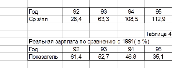 Из таблицы №4 видно, что реальная зарплата в период реформ неуклонно снижается, то есть снижается благосостояние населения. Интересно, что одним из «лозунгов» реформ является «приближение внутренних цен к мировым». Действительно, цены на товары и услуги растут, и реальная зарплата падает. Однако забывается, что в рыночной экономике труд - тоже товар, и цена труда тоже должна тогда приближаться к мировой. Но из таблицы №3 видно, что оплата труда в России гораздо меньше, чем на Западе. Ведь в США даже работа, оплачиваемая минимальной ставкой заработной платы при 8-часовом рабочем дне и 24 рабочих днях в месяце, принесет работнику $873,6. В России же средний работник получает в 8 раз меньше, чем самый дешевый рабочий в США. Причинами падения реальной зарплаты в РФ, при повышении уровня цен, можно назвать низкую производительность труда, недостаток капитальных вложений, инфляцию.