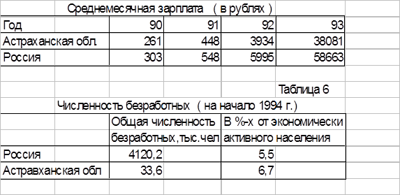 Из рисунка 11 видна закономерность, что чем выше в стране темпы инфляции, тем меньше темп прироста реальной заработной платы. Во всех странах СНГ реальная зарплата неизменно падает. Объяснить это можно тем, что номинальная зарплата - это достаточно жесткая величина, более жесткая, чем уровень цен. Тогда, чем больше инфляция, тем больше растут цены по сравнению с номинальной зарплатой. Это снижает реальную зарплату. Так проявляется взаимосвязь между зарплатой ( реальной ) и инфляцией. О взаимосвязи между зарплатой и безработицей уже говорилось. Рассмотрим ее на примере сравнения России и Астраханской области.