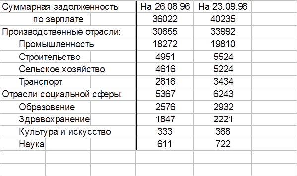 Одной из главных проблем экономики России является кризис неплатежей, включая и невыплату заработной платы. Причем проблема задолженности по заработной плате задела и коммерческие и бюджетные организации. Получается нонсенс, когда люди по несколько месяцев работают «бесплатно», не имея твердых гарантий в получении заработной платы. Проблема задолженностей по заработной плате должна быть решена в первую очередь, так как она приводит к обнищанию населения, к различным социальным конфликтам. Пока что задолженность по зарплате лишь растет. Масштабы этого явления видны, если проанализировать данные таблицы 8.