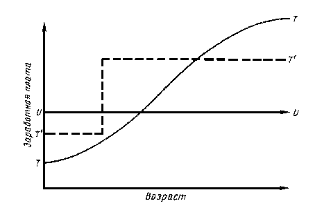 Благодаря подготовке эта кривая становится не только более крутой (как видно на графике), но и более вогнутой; говоря иначе, темп прироста заработков в молодые годы оказывается сильнее, чем в пожилые. Возьмем крайний случай и предположим, что подготовка повышает уровень предельной производительности, но никак не отражается на наклоне кривой, так что предельная производительность тех, кто получил подготовку, также не меняется с возрастом. Если заработки равны предельному продукту, ТТ окажется параллельна UU и просто будет лежать выше нее, без какого-либо наклона или вогнутости. Однако, так как в период подготовки заработки проходящих ее лиц будут меньше их предельной производительности, а впоследствии равны ей, они резко подскочат в момент завершения подготовки, а затем будут оставаться неизменными (как показано пунктирной линией Т'T' на графике), что придаст вогнутость всей кривой в целом. В этом крайнем случае возникает "крайняя" вогнутость (как у кривой ТТ); в не столь крайних случаях и вогнутость будет более сглаженной, хотя принцип остается тем же.