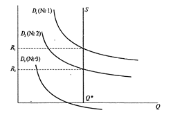 Выше мы говорили о том, что величина земельной ренты зависит от качества земельного участка. В нашем примере рассматривались земли, однородные по качеству. Введём в рассмотрение разное плодородие участков. Пусть на том же рисунке представлены три разные по качеству участка одинакового размера Q*. Кривые D1, D2, и D3 пусть отражают не изменение спроса, а предельную производительность земли в сочетании с другими необходимыми ресурсами на каждом из трёх участков. Таким образом, участок №1 является наиболее плодородным, а участок №3 – наименее плодородным. В результате владелец участка №1 получает ренту в размере R1, а участок №3 хуже предельного и должен быть выведен из сельскохозяйственного производства.