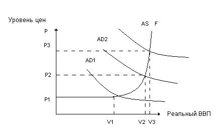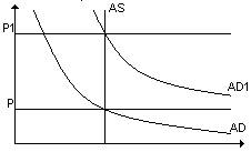 Экономическая теория, анализируя внешние и внутренние причины инфляции, сформулировала ряд теорий, объясняющих причины появления инфляционных процессов; инфляция спроса, инфляция издержек, количественная теория инфляции, инфляция ожиданий. Инфляция, инспирированная спросом, вызвана тем, что в какой-то момент своего развития экономика может тратить больше, чем способ на ……, т. е. будет стремиться к точке, находящейся за пределами кривой ее производственных возможностей. Графически это выразится в сдвиге кривой совокупного спроса АД вверх в положение АД1 , при практически фиксированном положении совокупного предложения AS (рис.1).