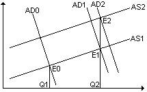Если же после повышения цен на энергоносители начнет осуществляться экспоненциальная денежно-кредитная или налогово-бюджетная политика с целью расширения совокупности спроса, то это приведет к сдвигу кривой совокупного спроса из положения AD0 в положение AD1 . Минуя точку E1 , экономическая система будет двигаться вверх вдоль кривой совокупности предложения AS1 и достигнет равновесия на краткосрочном временном интервале в точке E2 . Преодоление последствий «шока» предложения через расширение спроса произойдет быстрее, чем через корректировку относительных цен, однако издержки в виде повышения уровня цен будут более значительными. Кроме того, если расширение совокупности спроса окажется чрезмерным, появиться симптомы инфляции, инспирированной спросом.