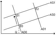 Допустим, система находится в состоянии долгосрочного равновесия в точке E0 при совокупном спросе АД0 и совокупном предложении AS0 . Реальный объем национального продукта находится на естественном уровне и равен Q. Предположим, что рост мировых цен на энергоносители повышает средний ожидаемый уровень цен на привлекаемые факторы производства. Поскольку фирмы ожидают повышения издержек, кривая совокупного предложения на краткосрочных именных интервалах сдвигается из положения AS0 в положение AS1 , так как фирмы сокращают объемы производства, экономическая система движется вдоль кривой совокупного спроса АД0 к новому состоянию равновесия в точке E1 . Однако в этой точке экономическая система не может находиться в равновесии на долгосрочном временном интервале, так как реальный объем производства не соответствует своему естественному уровню, а норма безработицы превышает естественное значение.