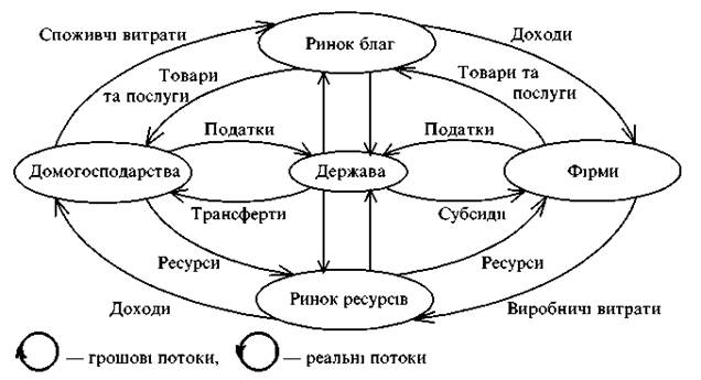 На ринку благ домогосподарства купують необхідні їм товари і послуги у фірм. На ринку ресурсів, навпаки, фірми купують у домогосподарств необхідні їм ресурси: капітал, робочу силу, природні ресурси для здійснення виробничого процесу. Економічна система є замкненою. Доходи одних економічних суб'єктів є витратами інших економічних суб'єктів. У моделі наявні два види потоків: "доходи—витрати" та "ресурси—товари" і послуги. Вони здійснюються одночасно у протилежних напрямах і постійно повторюються. Потік товарів і послуг здійснюється проти годинникової стрілки. Ринки благ та ресурсів балансуються потоками грошових платежів за годинниковою стрілкою. Домогосподарства на ринку благ здійснюють грошові платежі. Фірми на ринку ресурсів також купують робочу силу, капітал, природні ресурси, здійснюючи при цьому грошові витрати. Держава бере участь у регулюванні економіки трьома способами: 1) збиранням податків; 2) здійсненням державних витрат; 3) регулюванням кількості грошей в економіці.