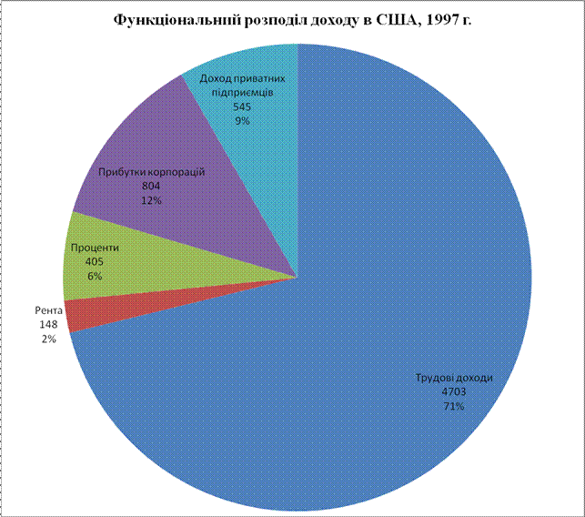 Функціональний розподіл совокупного національного доходу в США за 1997 р. зображено на малюнку вище. Очевидно, що найбільшим джерелом доходу домогосподарств служать заробітна плата і платня, що виплачується робітникам і службовцям компаніями або державними установами, які наймають їх на роботуі. У змішаній економіці основна частина загального сукупного доходу приходить на працю, а не на "капітал". Дохід приватних підприємців-власників - лікарів, адвокатів, дрібних власників, фермерів - є, по суті, комбінацією заробітної плати, прибутку, ренти і відсотка. Деякі види таких платежів є платою за власну працю, інші - прибутком від власного бізнесу. Суть інших трьох джерел зрозуміла з їх назв. Деякі домогосподарства володіють акціями корпорацій і отримують від них доход у вигляді дивідентів. Багато домогосподарств володіють також облігаціями та ощадними рахунками, які приносять прибутки у вигляді процентів. Рентний доход домогосподарсва отримують за надання компаніям будівель і природних ресурсів (включаючи землю).
