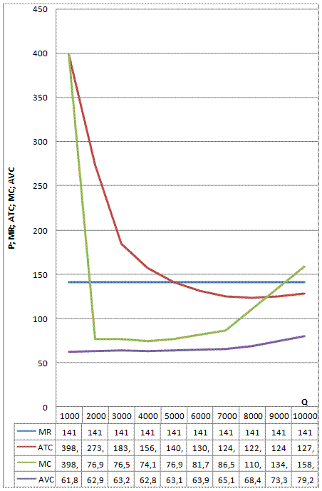1)Згідно бухгалтерського аналізу за ціною 141 грошових одиниць максимальний прибуток можливо отримати при такому обсязі виробництва, коли різниця між сукупним доходом та сукупними витратами буде найбільшою, тобто буде максимальний прибуток. Згідно розрахунків цій умові відповідає обсяг випуску продукції в розмірі 8000 шт. Рентабельність буде дорівнювати 14,92%.