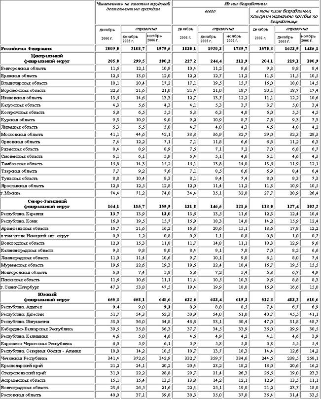 На конец 2006 года, по оценке Госкомстата РФ, общая численность безработных в России возросла на 0,5% по сравнению с 2005 годом . и составила 5775,2 тыс. чел. Уровень безработицы в стране составил в соответствии с методологией МОТ 8% всего экономически активного населения страны. При этом число официально зарегистрированных безработных в 2006 годом выросло на 3,9% по сравнению с 2005 годом и составило 1920 тыс. чел. (31,4% от общего количества безработных). (см. рис. 1).