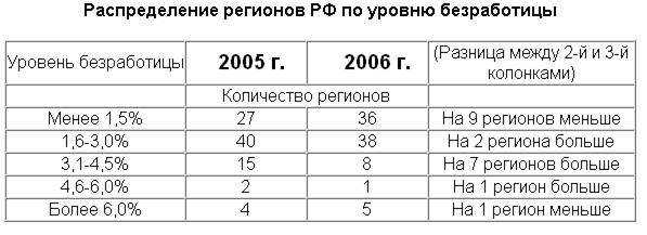 Что касается территориального распределения безработицы, то следует обратить внимание на существенные сдвиги в распределении регионов по группам, произошедшие за год, причем в негативную сторону. В 2006г. по сравнению с 2008 г., по данным Рабочего центра экономических реформ при Правительстве РФ (РЦЭР), существенно (на 9 штук) сократилось число регионов с минимальным (менее 1,5%) уровнем безработицы (см. таблицу).