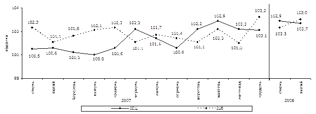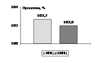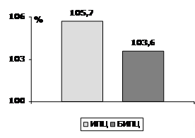 Базовый индекс потребительских цен (БИПЦ) – это показатель, который характеризует инфляцию, которая вызвана давлением со стороны спроса, т.е. отображает эффекты от изменения реальных монетарных условий, фискальной политики, а также непредвиденных шоков спроса. Базовый индекс потребительских цен (БИПЦ) в декабре 2008г. составлял 102,0% , с начала года –103,6% . (Рис.1)