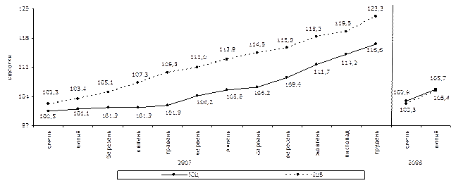 Рис.1. Базовый индекс потребительских цен в Украине в 2008 году(к предыдущему месяцу и к декабрю предыдущего года)[2]