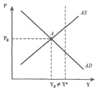 Кейнсианская экономическая теория оспаривает существование такого механизма саморегулирования. На основе эмпирических данных, полученных в период Великой Депрессии, Д. Кейнсу удалось доказать, что полная занятость в нерегулируемой экономике может возникнуть только случайно. Равновесие спроса и предложения (рисунок 1.1), как правило, не совпадает с полной занятостью ресурсов: в точке А устанавливается равенство AD = AS , однако равновесный объем производства Yg < Y '.