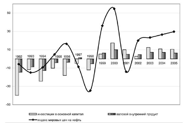 Рисунок 2.1. Изменение темпов роста ВВП, инвестиций в основной капитал и уровня мировых цен на нефть в 1992–2005гг. (% к предшествующему году)