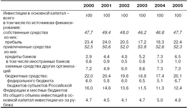 В отличие от 2004 г., в структуре инвестиционных ресурсов наблюдалось повышение доли бюджетных средств в финансировании инвестиционных расходов на 2,2 п.п., инициированное ростом инвестиции за счет средств федерального бюджета. Доля банков в кредитовании инвестиций в 2005 г. составила 6,5% и снизилась на 1,4 п.п. по сравнению с предшествующим годом. На фоне сдержанного поведения банковского сектора продолжала действовать тенденция к повышению участия страховых и инвестиционных компаний, промышленных и торговых предприятий, а также иностранного капитала в финансировании инвестиционной деятельности.