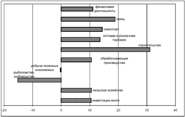 Рис. 2.4. Динамика роста инвестиций в основной капитал по секторам и отраслям экономики за период 2000–2005 гг., в % к 1999 г.