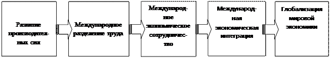 Следующим этапом явилась международная экономическая интеграция, объективно обусловленная углублением международного разделения труда, интернационализацией капитала, глобальным характером научно-технического прогресса и повышением степени открытости национальных экономик и свободы торговли. Интеграция в переводе с латинского (integratio) означает соединение отдельных частей в общее, целое, единое.