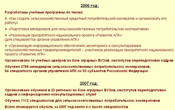 Развитие сельскохозяйственной потребительской кооперации является частью второго направления приоритетного национального проекта "Развитие АПК" .