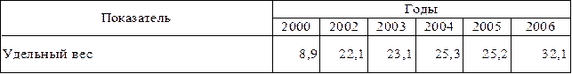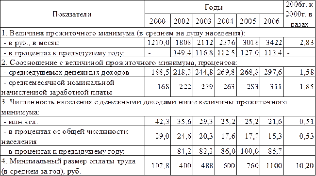 В табл. 3, 4, 5 представлены данные, характеризующие динамику изменения МРОТ и прожиточного минимума, а также удельный вес МРОТ в величине прожиточного минимума трудоспособного населения страны за 2000-2006 гг. Как видно, существует значительная разница между показателями, приведенными в таблицах. Это стало следствием известных трудностей, связанных с выходом из кризиса, сложившемся в экономике страны в 90-х гг. XX в. Значительное уменьшение доли МРОТ в ПМ в 2000г. явилось следствием дефолта 1998г., когда резко упал ВВП, уменьшился объем производимой продукции, возросла инфляция. Относительно невысокие темпы роста ВВП, наблюдаемые после этого периода, а также невосстановленные объемы деятельности отечественных предприятий, прежде всего в промышленности и сельском хозяйстве, по прежнему оказывают серьезное влияние на соотношение указанных показателей. В перспективе на 2007-2010 гг. важнейшей задачей российского правительства является сближение и уравнивание минимального размера оплаты труда с величиной прожиточного минимума.