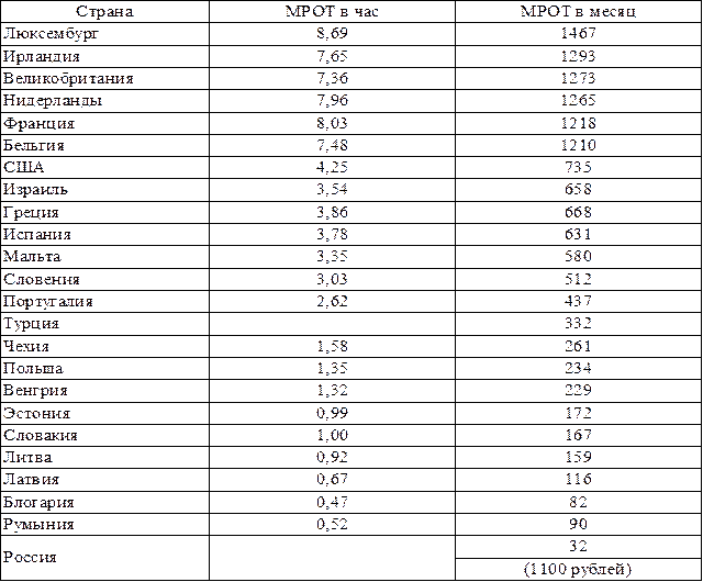 В зарубежных странах государственный МРОТ регулярно пересматривается с учетом уровня инфляции и других факторов. Например, во Франции разработан механизм, предусматривающий автоматический рост размера МРОТ при росте цен на 2 %. В США МРОТ изменяется по мере необходимости, но законодательством не предусмотрены государственные обязательства по его пересмотру. В целом, регулирование МРОТ осуществляется на основе законов (США, Франция, Испания и др.) и соглашений (Великобритания, Германия, Италия и др.). Определенное воздействие на доходы трудящихся оказывают фонды потребления, т. е. соответствующие социальные выплаты или социальные фонды государства и предприятий. В странах Западной Европы размер минимальной месячной зарплаты превышает российский в десятки раз, составляя в среднем от 400 до 1500 евро, напомним, что в России минимальный размер оплаты труда (МРОТ) составляет 1100 рублей в месяц (эквивалентно примерно 32 евро) (табл. 6).