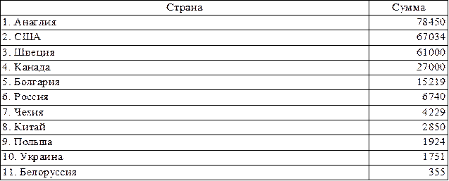 Данные о размере среднемесячной заработной платы работников в ряде стран мира за 2006 г. (в пересчёте на руб.)