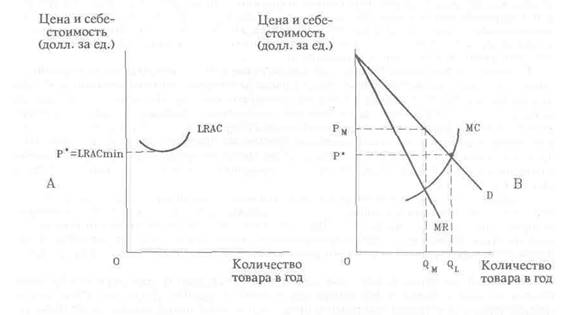 Рис. 1.1 Ценообразование, ограничивающее вход в отрасль. Оно результативно тогда, когда существующие на рынке продавцы устанавливают цену на товар ниже чемLRACmin потенциальных производителей. График А показывает, что LRACmin потенциального производителя равны Р*. На графике В, чтобы помешать такой фирме выйти на рынок устанавливают цену не выше Р*. Эта цена ниже максимизирующей прибыль цены рм.