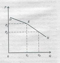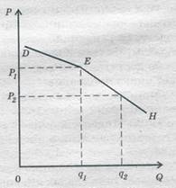 Предположим, у фирмы цена за единицу продукта — OP1 ,а объем продаж — Oq1 , (рис. 1.2). DEF — линия спроса на товары фирмы. Она принимает решение повысить цену на свои товары. Новая цена — OP3 ,. Другой вариант: фирма понижает цену до OP2 ,. Предположим далее, что соперники следуют за фирмой при установлении цен. В таком случае JEHпредставляла бы кривую спроса фирмы, совпадающую с кривой спроса ее соперников.