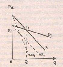 Во втором случае конкуренты могут следовать за фирмой – олигополистом, изменяя цены в ту же сторону. Тогда изменение цены существенно не отразится на объеме спроса на продукцию «Апполона»: при повышении цены рынок фирмы лишь немногосократится, а при понижении — может слегкаувеличиться, так как сокращение или, соответственно, увеличение объемов продаж равномерно распределятся на всех участников олигополистического рынка. В этом случае кривая спроса «Апполона» будет иметь низкую эластичность по цене, что отражено на графике (рис. 1.4, кривая D1 ). Однако, не зная, какую линию поведения выберут конкуренты, логично предположить следующее. В ответ на повышение цены «Апполоном» другие фирмы скорее проявят вялую реакцию и не последуют примеру этой фирмы. Напротив, в ответ на снижение цены, другие фирмы, скорее всего, последуют за ней, желая сохранить свои доли на рынке. Таким образом, в сложившихся условиях олигополисту не выгодно менять объемQf и установившуюся цену Рf ,что и обусловливает жесткость цен на олигополистическом рынке. Кривая спроса на продукцию такого олигополиста учитывает оба варианта реакции конкурентов на отклонение от текущей цены, которая изображена на рис. 1.4) на уровне Р f .Конкуренты не реагируют, когда олигополист устанавливает цену выше текущей, и, наоборот, реагируют, когда цена опускается ниже текущей. Этим и объясняется ломаная конфигурация кривой спроса фирмы –олигополиста (рис. 1.5, криваяD2 Рf D1 ). Она состоит из участка пологой кривой D2 Рf допересечения ее с линией текущей цены Рf и участка кривой Рf D1 сболее крутым наклоном после пересечения ее с линией текущей цены. Следовательно, ломаная конфигурация и у кривой предельного дохода (рис. 1.5, кривая МR2 МR1 ). Однако, в отличие от кривой спроса, кривая предельного доходаМR2 МR1 , имеет разрыв, или вертикальный пунктирный отрезок, лежащий на перпендикуляре, опущенном из точки Рf на ось абсцисс. Величина данного разрыва показывает, в каких рамках могут изменяться предельные издержки, не нарушая равновесного объема производства фирмы – олигополиста.