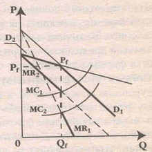 Если возможно значительное изменение издержек, причем такое, что предельные издержки выходят за пределы вертикального участка графика предельной выручки, фирма – олигополист будет изменять цену и объем, не считаясь уже с реакцией соперников (рис. 2.3).