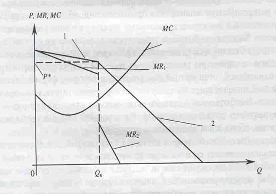 Рис. 2.1. Фирма на олигопольном рынке в условиях негладкой функции спроса: 1 — эластичный участок кривой рыночного спроса; 2 — неэластичный участок кривой рыночного спроса;МR1 , — предельный доход, соответствующий эластичному участку кривой рыночного спроса, МR2 - предельный доход, соответствующий неэластичному участку кривой рыночного спроса; МС- предельные издержки; P* - — оптимальная цена продукции; Qn — оптимальный объем производства.