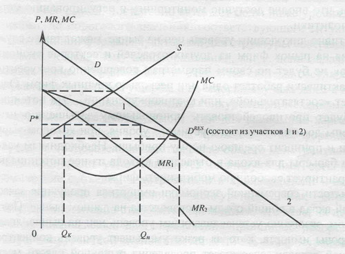 В точке на оси цен, в которой аннулируется объем предложения конкурентного окружения, наблюдается излом функции остаточного спроса на продукцию доминирующей фирмы — ценового лидера (рис. 2.1). Ниже излома остаточный спрос совпадает с общим рыночным спросом, так как предложение конкурентного окружения здесь нулевое. Каждому из двух участков остаточного спроса соответствует свой участок графика функции предельного дохода (М R 1 и М R 2 ). В точке излома графика функции остаточного спроса наблюдается разрыв графика предельной выручки (M R).