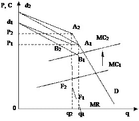 В реальной жизни существует практика ценообразования на основе прибавления к средним издержкам определенного процента прибыли. Такой способ применяется тогда, когда предприятия не знают, как изменится их кривая спроса в области излома в сравнении с первоначальной. Поскольку все фирмы повышают цены одновременно, каждая надеется сохранить свою долю рынка, перенеся бремя подорожания ресурсов на потребителей, и увеличить прибыль на единицу выпускаемой продукции. Эту ситуацию описывает модель «осознанного параллелизма» (рис. 2.3). Фирмы ведут себя одинаково, предполагая, что все фирмы отрасли захотят перенести бремя роста стоимости ресурсов на покупателей путем повышения цен на свою продукцию. Точка А1 переместится в положение А2 , а кривая спроса будет представлена графиком d2 A2 D. Соответствующая цена и объем выпуска, которые выберет для максимизации прибыли фирма – олигополист составит Р2 q2 .