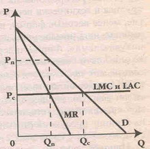 На рис. 2.4 LMC и LAC означают соответственно предельные и средние издержки в долгосрочном периоде. Q n — объем производства картеля, состоящий из квот входящих в него фирм. Р c — цена, которая установилась бы в условиях совершенной конкуренции, а Q c — объем производства, соответствующий условиям совершенной конкуренции. Сговор облегчается в том случае, если фирмы – олигополисты, входящие в картель, имеют приблизительно одинаковый уровень издержек производства и производят однородную продукцию.