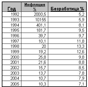 В условиях трансформационного кризиса в России нет никакой функциональной зависимости межу приростом ВВП и безработицей, т.е. закон Оукена не работает, а так как безработица находится в обратной зависимости с инфляцией, то следовательно, обратная зависимость наблюдается так же между приростом ВВП и инфляцией ( см. таблицу 2)