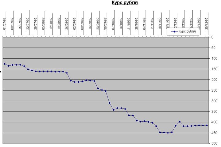 Дилемма, когда перед государством стоит выбор между безработицей и инфляцией, вылилась в активные дискуссии между экономистами того времени. Существует мнение, согласно которому катастрофическое сжатие денежной массы в течение 90-х является результатом ведущейся против России финансовой войны, а сам же монетаризм выступает как мощное информационное оружие, направленное на развал экономики и всего народного хозяйства страны, но что я лично с уверенностью могу констатировать, так это то, что в России не было истинной монетаристской политики, как, впрочем, и шоковой терапии. Я вижу следующие причины этому: В январе 1992 года были отпущены цены на большинство товаров, ликвидирована вся централизованная система распределения ресурсов, но при сохранении общей монополизации производства, это привело к невероятной инфляции, к концу 1992 года в 100-150 раз при росте средней заработной платы в 10-15 раз[17] . Эти действия команды Гайдара вызвали резко отрицательную реакцию со стороны вице-президента А.В. Руцкого и председателя верховного совета Р.И. Хасбулатова. К началу лета 1992 года мощный проинфляционный блок «Гражданский союз», куда входили представители военное промышленного и агропромышленного комплекса, боявшихся либерализации цен на энергоносители, что грозило банкротству большей части предприятий. Опасаясь банкротства директора предприятий и лидеры профсоюзов выступили за поддержку инфляции и обосновывали это, как меньшее зло для населения, нежели их банкротство и безработица для населения. В апреле 1992 в этом их поддержал шестой съезд народных депутатов и средства массовой информации. Правительству Гайдара пришлось считаться с этим, и они пошли на курс нивелирования. Предприятиям были выданы льготные кредиты, ход реформ поменялся, произошёл отход от курса на стабилизацию, сокращения инфляции, бюджетного дефицита. Результат : Осенью произошёл обвал рубля (в три раза за два месяца), резко усилился рост цен – 5% в сентябре-ноябре[18] (см. рис 2).