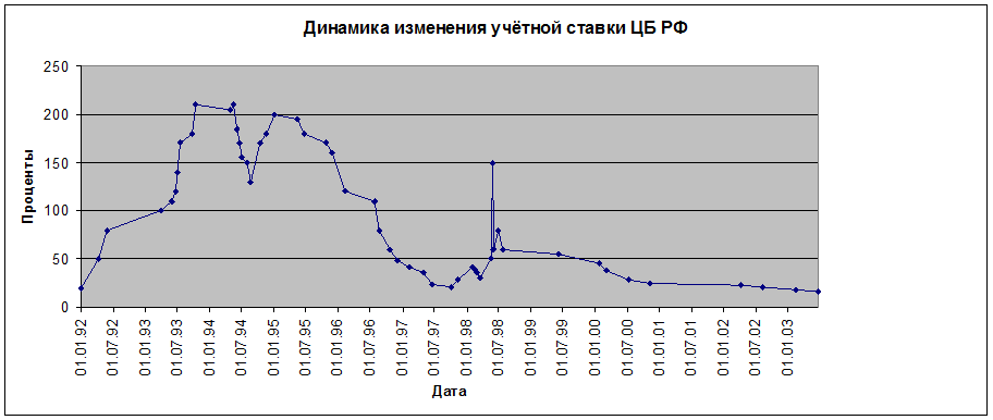 Начиная с 1993 года, государство после инфляционных потрясений, вызванных дезорганизацией вследствие политической нестабильности, уверенно двигается, намеченным путём политики Гайдара, а именно проводит курс «дорогих денег». На графике видно, как начиная ещё с 1992 года учётная ставка поднимается и занимает максимальное за год положение в 80% (см. в конце приложение 1 ), в 94 году пик пришёлся на 15 октября и составил 210%. Судя по графику, очевидно, что жёсткая рестриктивная политика существовала на протяжении всего 93, 94, 95 гг., и именно на эти года начала активно себя проявлять тенденция к увеличению безработицы населения, вместе с тем инфляция идёт на спад, но тем не менее двузначных чисел принимает только в 1996 году (см. таблицу 1).. Фактически за три полных года проведения политики «дорогих денег, что говорит, нам о всей глубине кризиса нашей экономике 90-х. (все-таки курс на дальнейшую жёсткую экономическую политику был продолжен – читайте ниже ).