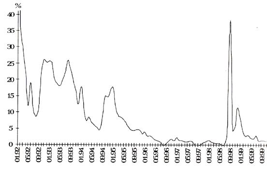 Борьба этих двух лагерей в течении 1993 года привела к неустойчивому экономическому положению, что выразилось в колебании уровня инфляции от 12-35% в месяц. В 1993 году министром финансов становится ныне покойный Б. Фёдоров. Его политика дальнейшей стабилизации удержала страну от пропасти. Представлю график, где можно понять дальнейшую политику государства начиная с 1993 года (см. рис.3) (приложение данного графика дано в конце курсовой работы ):